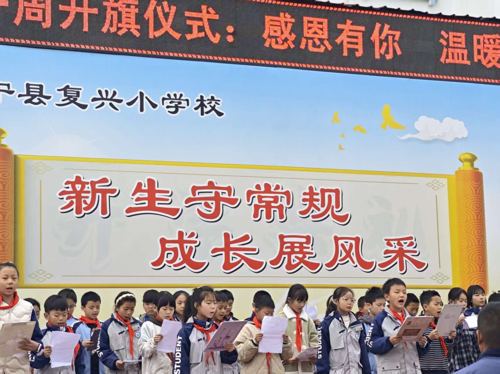 晨光温柔洒满复兴小学的操场,伴随着清脆的铃声,全校师生整齐列队,迎来了以 “感恩有你,温暖前行” 为主题的第十一周升旗仪式。这场充满爱与敬意的仪式,让感恩的种子在少年心中破土生长,让温暖的力量在校园里悄然传递。国旗护卫队的同学们身着整洁校服,迈着坚定有力的步伐,护送五星红旗走向升旗台。当雄壮的《义勇军进行曲》奏响,鲜艳的国旗冉冉升起,全体师生肃立注目,目光中满是崇敬。胸前的红领巾与国旗同色,这一刻,感恩祖国的庇护、感恩校园的培育,都化作了眼中的真挚与心中的暖流。