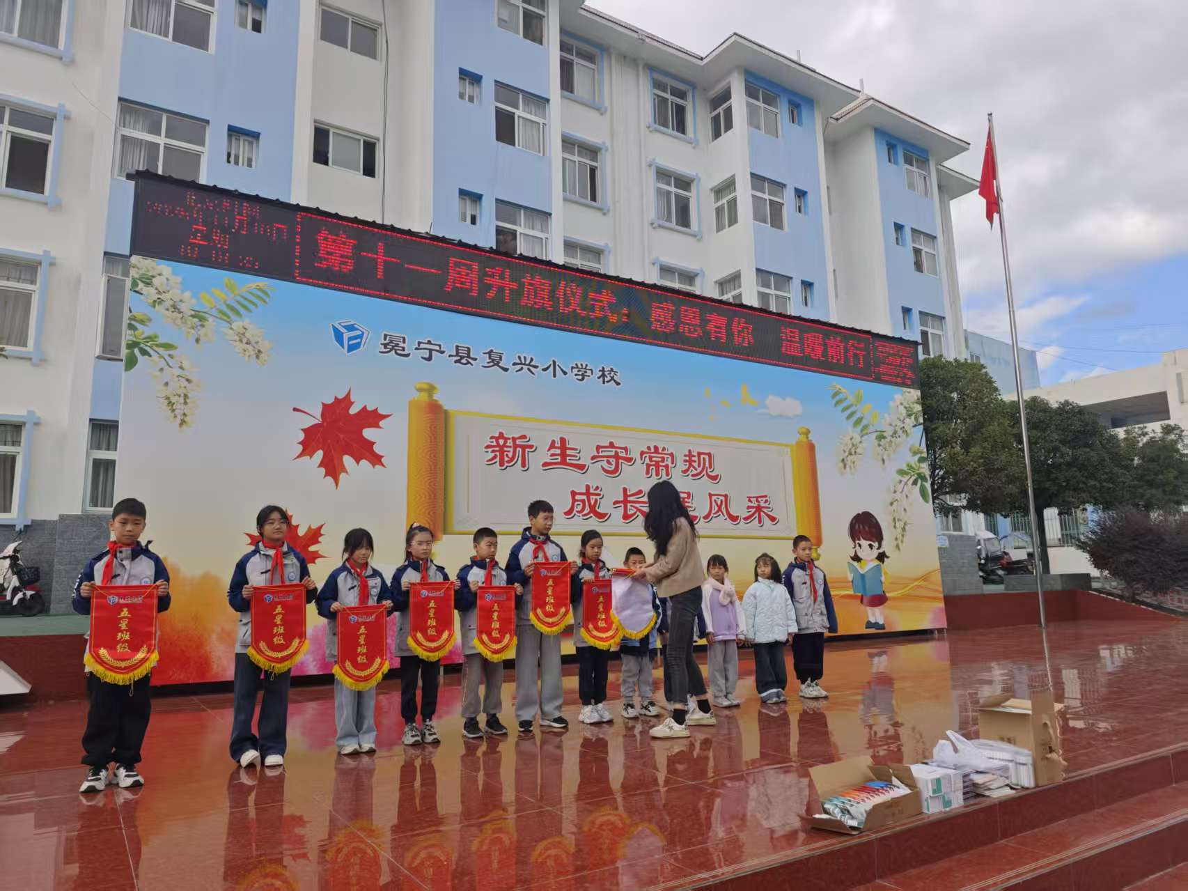 仪式第三项:上周的值周老师为上周学校的教学、卫生、纪律等方面进行总结,值周教师宣布上周获得流动红旗的班级是:1年级2班、1年级4班、2年级3班、3年级班、4年级1班、4年级班、5年级2班、5年级3班、6年级4班,为获奖班级颁发流动红旗,并鼓励全体学生向优秀班级学习,共同营造良好的校园氛围。